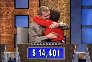 | Former Jeopardy! champion Ken Jennings congratulating challenger Nancy Zerg shortly after defeating him |