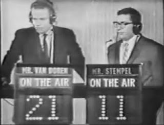 The process began by Enright docking Stempel’s total earnings and using that money as insurance for the producers in case they got “caught in the act”. It eventually resulted in the producers forcing Stempel to lose his next game against his next challenger, Charles Van Doren. One of the questions that Stempel was told to take a dive on was pertaining to the category of “Movies and Movie Stars”. The question was “What motion picture won the Academy Award for 1955?” The correct answer was Marty--- but Stempel was told to give the answer On The Waterfront. It was ironic that he was told to take a dive on that question because Marty was his all-time favorite movie; therefore, he knew the answer prior to being coached the correct answer to that question. On a side note, while I was watching the Stempel/Van Doren episode, I noticed that Stempel looked sad and heartbroken while he was answering that question because of the fact that after he lost this game, he would revert from the lap of luxury to mundane process that was his life. However, the question that ultimately decided the winner of the fifth game (at $2,500 a point) was “Name the second, third, fourth, and fifth wives of Henry VIII and describe their fate”. That night, about 15 million viewers all across the nation watched as Charles Van Doren become the new champion winning $20,000 that night. Van Doren was a handsome, quick-witted, American Bachelor who was smart as a whip and was perfect eye candy for the home viewers. This Columbia University professor was everything that Enright was looking for when searching for the “perfect contestant” for Twenty-One. Since Van Doren’s began his “reign of terror” on December 5, 1956, Van Doren’s and the show's popularity flourished. Van Doren won a total of $129,000 on the show, made it to the cover of an issue of Time Magazine, was hired as a host of NBC’s Today Show, and was praised by his students and viewers alike. Twenty-One was now the most popular show on television, constantly beating I Love Lucy in the primetime ratings until after the spring of 1957, when Van Doren lost. Van Doren eventually lost to Vivian Nearing on March 11, 1957. Meanwhile, a dejected Herb Stempel was still feeling bitter about throwing his final game. There was even one instance when while he was walking through the backstage, two technicians were talking amongst themselves, and one said, “At least we finally have a clean-cut intellectual on the program, not a freak with a sponge memory”. Stempel felt hurt, used and betrayed when he left the studio. Upset by this matter, he attempted to blow the whistle on Enright’s whole ploy by calling Jack O’ Brian, a columnist for the Journal-American newspaper, to report the whole story of what was really happening. No one would buy Stempel’s story “because there was no real [confirmation] from anybody else who had been on the show [that it had been rigged]”.(1) The newspapers refused to print the story until two things happened: the Dotto Scandal, and the discovery of proof that Twenty-One had been rigged.