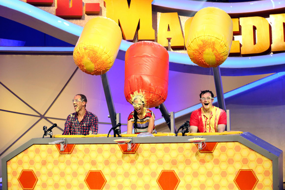 In some of my previous news updates about Spell-Mageddon, I compared the show's format as being like a mixture between Distraction and the Scripps National Spelling Bee. After watching the premiere episode, I am also adding Wipeout to the concoction. Spell-Mageddon is a very fun and amusing game show to watch. It's a little cheesy and corny, but it works for this "family-friendly" network. It has all elements needed to produced a great game show: speed, strategy, knowledge, physical and mental endurance and skill, suspense, high stakes and a hint of comedy. The increased difficulty in the words are appropriate for each round of gameplay. I also like how the producers added a few "curveball" words in the third round that might be commonly misspelled, especially when placed under pressure. The moments that stood out the most in the first episode of Spell-Mageddon was the very colorful set, something that you rarely see that in game shows nowadays other than The Price Is Right, and how suspenseful and intense the "Sensory Overload" end game is. Just imagine spelling all of those words at five letters a second under the immense pressure of outdoing your opponent and the makeshift environment. But, I digress.