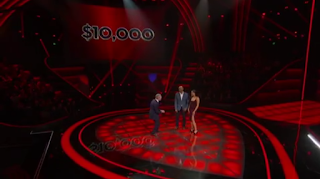 It is very difficult nowadays to find a primetime game show that does not utilize a dark set. Gone are the days were stages were brightly lit, colorful and full of personality. This set is not much different from others seen on various other shows such as ABC’s Millionaire, Deal or No Deal or 500 Questions. Although the enlarged and elongated digital displays are vibrant and impressive, the rest of the dimly-lit set leaves much to be desired.